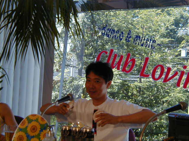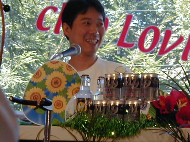 CMの間はじゃんけん大会になりTシャツやアロハがプレゼントされる。うーん、太っ腹っ!!その上、正岡さん特製のカクテル「Strawberry Fields Foerever」が正岡さんファンのははに当る。よかったねぇ(^^)私も一口飲ませてもらったけどとっても甘くてきれいなカクテルでした(^^)だけど4時も過ぎてきてどんどん寂しくなってくる。今からこんなでどうするんだ。後半のリゾートミュージック対決へ。杉さん&薫ちゃんチームは杉さん選曲でクリフ・リチャードの「サマーホリディ」を。「小学校の頃、この歌がはやってて、『今度扇風機買うんだけど首振りじゃぁどぉ(クリフリチャード)?』とか『じみーっ!!へんどりっくつはやめなさい!(ジミーヘンドリックス)』ってつまんないダジャレが流行っててそれ覚えてるんですけどねぇ」「でもそれ小学生でジミーヘンドリックスってすごいなぁーっ」「最近じゃほとんど扇風機首振りなんですけどね(笑)」でも外タレさんの名前でしゃれなんて小学生の時はやってたなんてすごい。「ポップな小学生ですねー。」対してシャーベリーズチームは「和田弘とマヒナスターズ」の「渚のバラード」を。勝敗は圧倒的に杉さん&薫ちゃんチームの勝ち。「商品はクニ片山さんから秘蔵の南沙織写真と熱いキッスを」って(笑)「秘蔵って内臓の脾臓じゃないですよねー。」ってすかさず突っ込む杉さん(笑)「レントゲン貰ってどないすんねん」って(笑)